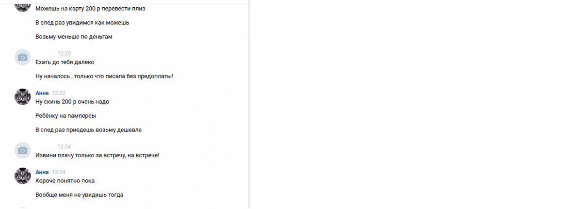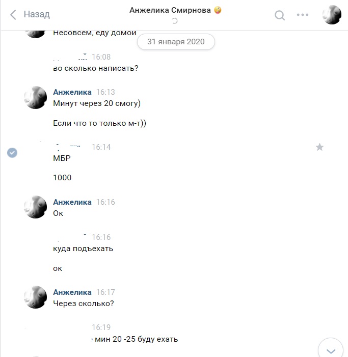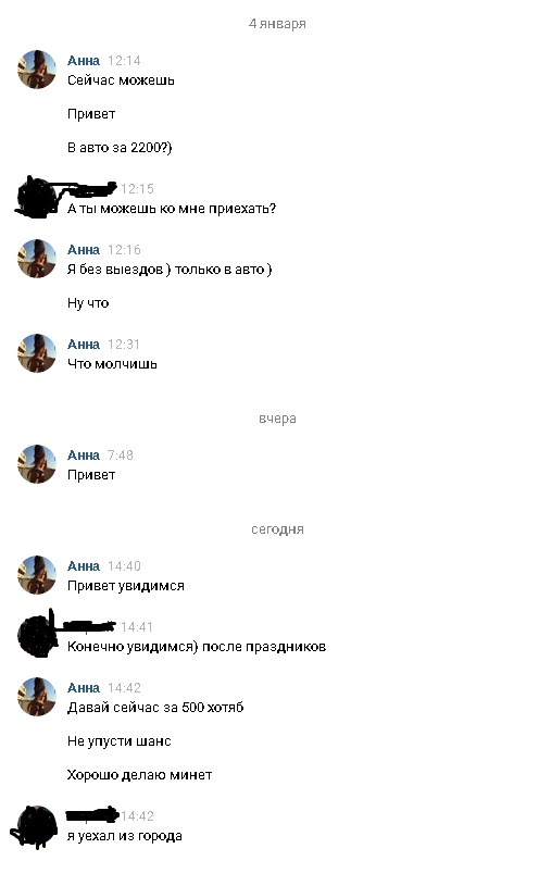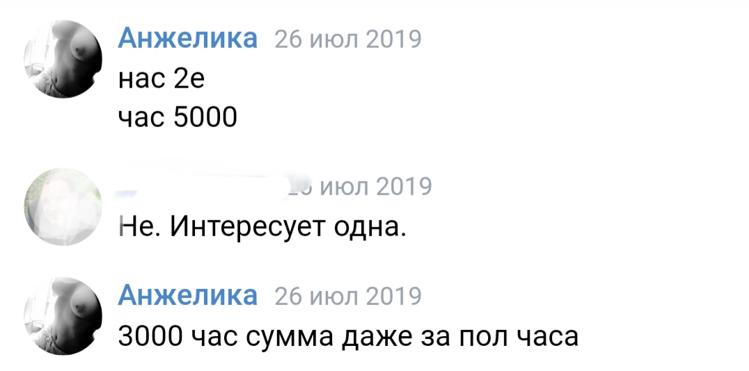 Написал ей. Ответила, что встреча будет стоить 2000. Что именно входит в эту стоимость не уточняла и я не спрашивал, так как дальше диалог был просто аншлаг. Пишу ей, мол, это конечно все хорошо, но мне бы тебя хоть бы на фото где увидеть, я же должен понимать как ты выглядишь. Она ответила, что замужем и фото не высылает)) А потом добавила: «не хочешь, как хочешь». Какой кирпич ей на голову упал я не знаю, но она явно сломалась.