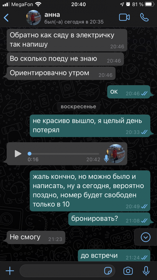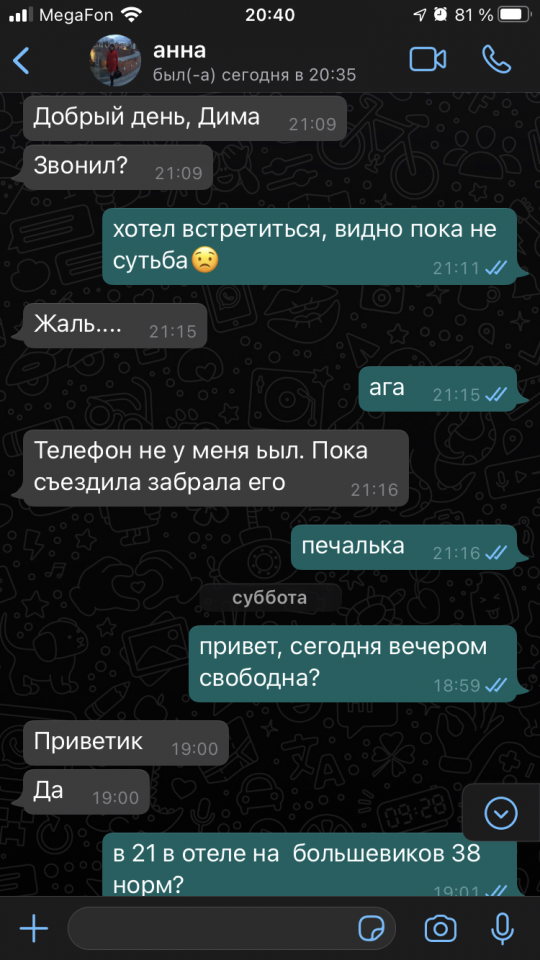 договаривались о встрече в вацапе, она согласилась, но через пару мин, написала , что уезжает. а на сайте дурку включает, как будто общаюсь с двумя разными людьми