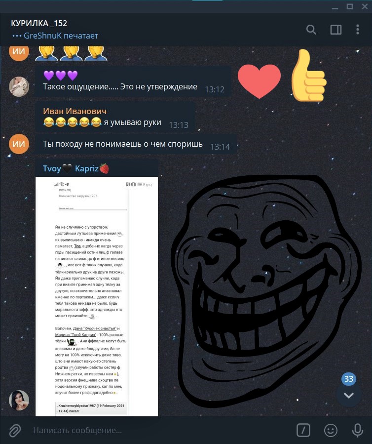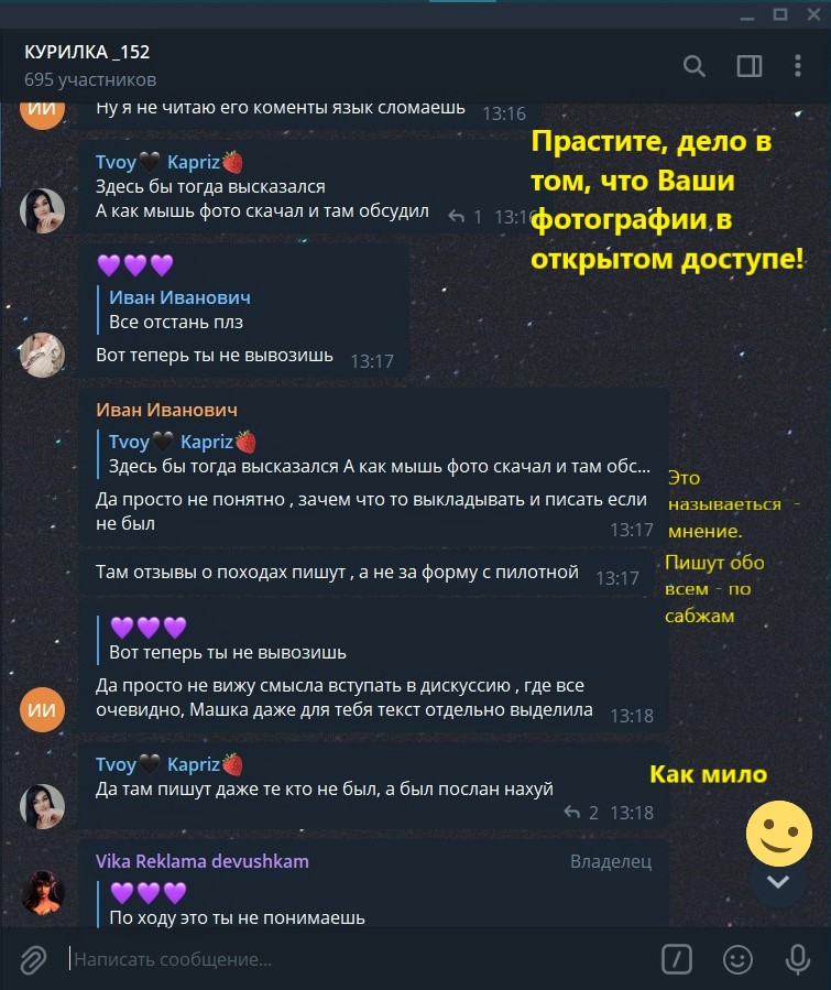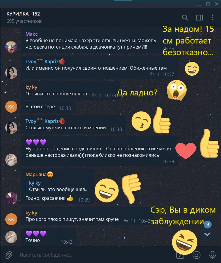Короче, "сфера досуга" варится в собственном соку и благодаря низкому качеству "кадров" сок этот в основном ядовитый. Отчеты на форуме в последнее время больше напоминают рефлексию или информационный билютень о том, куда лучше не соваться