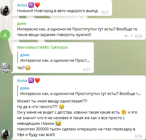 В https://t.me/Vzroslyy152 на нее несколько человек жаловались :082: , что она именно "одноглазая", но без развернутых аргументов, приезжали - увидели - фитбек в чат :311: , на это она оправдывалась, тем, что якобы глаз у нее на месте, но нужна операция в г. Уфа, на которую она копит несколько сотен тысяч (насколько помню), я ей в чате писал, чтобы она как то предупреждала заранее клиентов о своем недоразумении, чтобы не пугать так сказать людей :329: и не было подобной обратной связи по ней в чате.