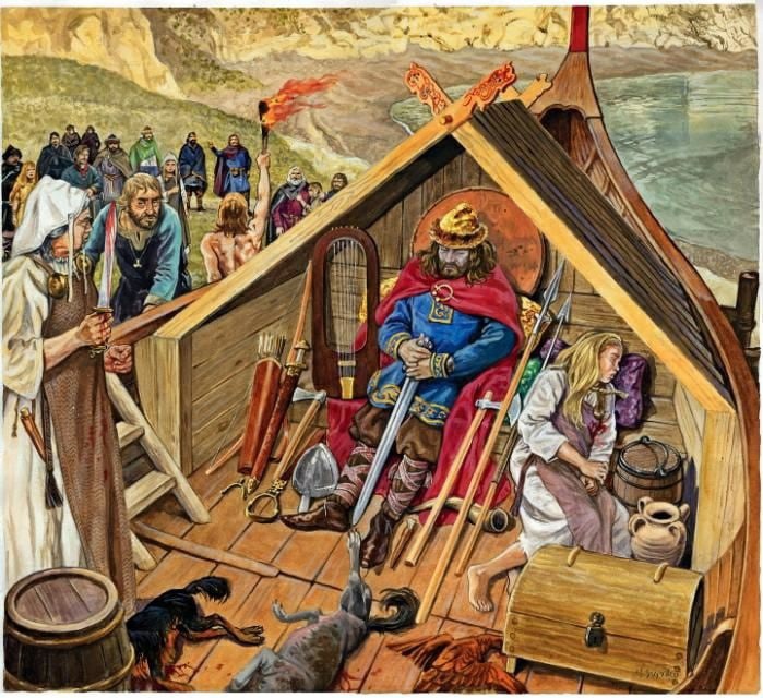 В качестве спутников с ним отправляется дева и домашние животные. Сам он отправляется к Всеотцу с богатым скарбом и в крупном карви (драккар по типу корабля из Гокстада).