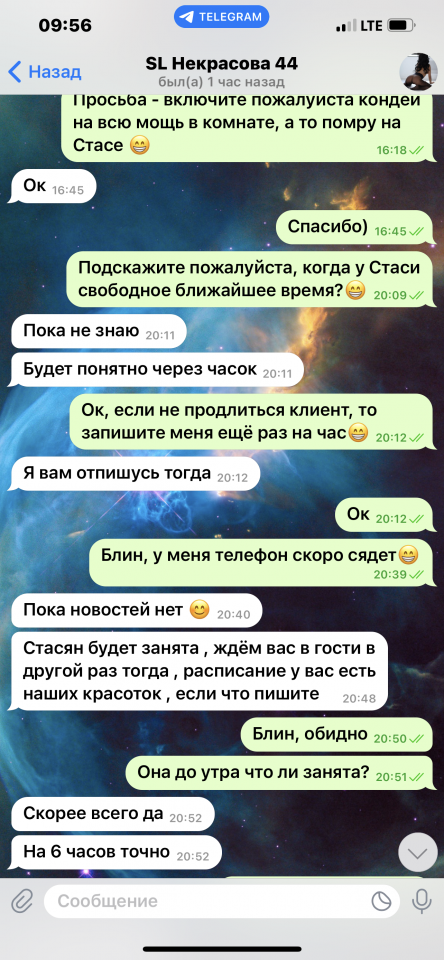 Далее был странный диалог с админом которая наебалась во времени и в 22:34 написала мне что я записан на 22:20. И после 2х указаний на то что она наебалась, ничего кроме «мы вас ждём» не ответила.