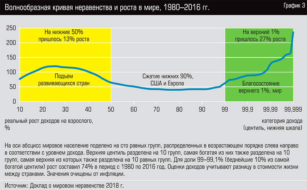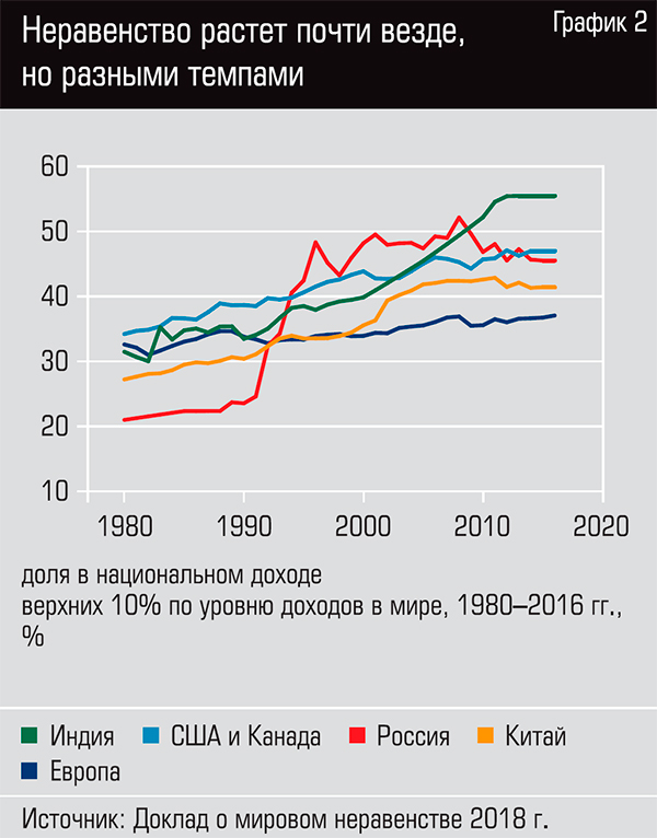 После развала СССР и победы США в Холодной войне тенденция развернулась вспять, и к настоящему времени имеем ситуацию, как на второй картинке. Причем в России неравенство еще больше, чем в мировом масштабе.