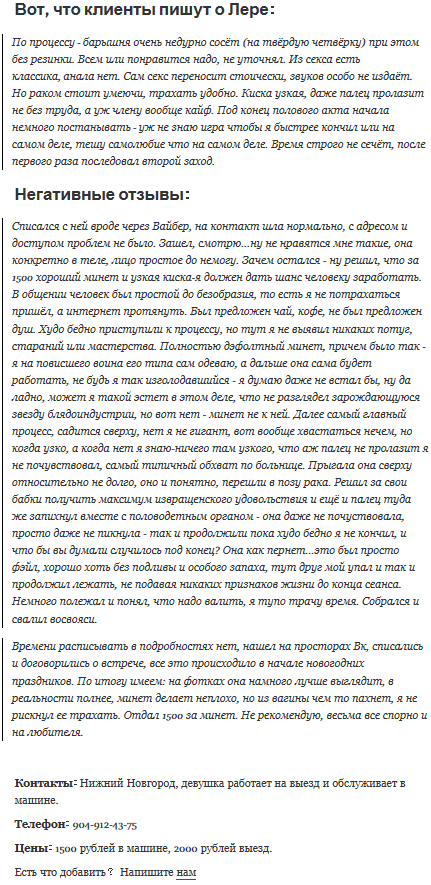 На фотках она намного лучше выглядит, в реальности полнее, минет делает неплохо, но из вагины чем то пахнет я не рискнул ее трахать. Отдал 1500 за минет.