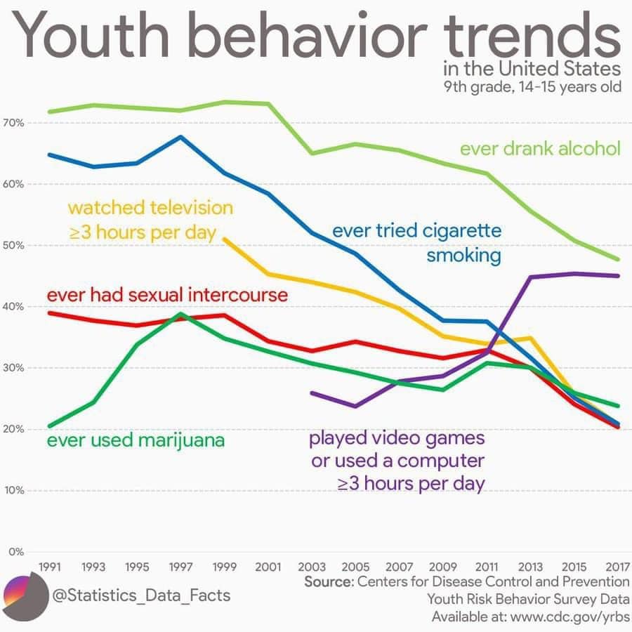 За последние двадцать лет в этой возрастной среде резко упало потребление алкоголя, марихуаны, сексуального экстремума (в т.ч. подростковой беременности, изнасилований), курения. Пик всего этого пришёлся на вторую половину 1990-х.