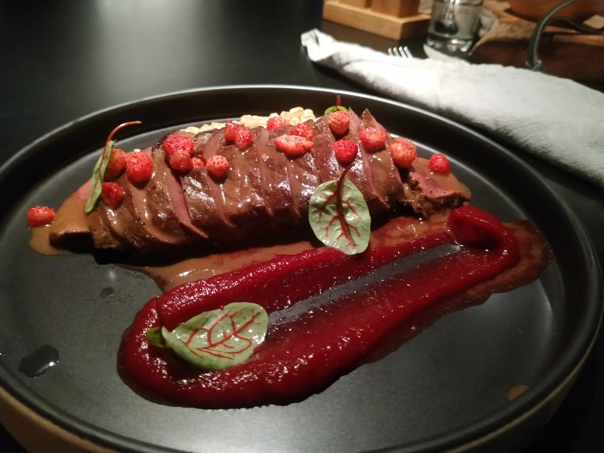 - Сердце оленя с земляникой и перловкой (880р). Нарезано брусками, имеет характерную текстуру сердечной мышцы, тонкий специфический вкус.
