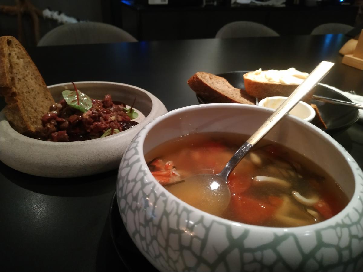 - Щи Териберские (680р). Это не щи, а суп из морепродуктов (креветки, гребешки, краб, кальмар, морская капуста). Вкусная сытная похлёбка! С хлебом и устричным маслом зашло отлично.