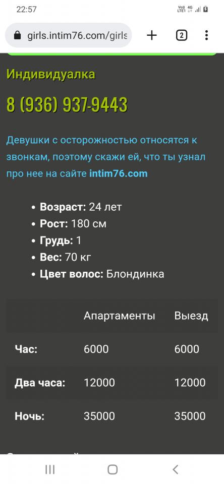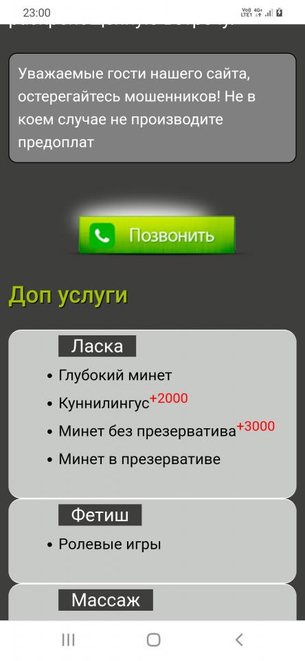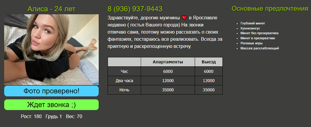 Фото в анкете её. Сама ухоженная, бритая, есть тату. Встречает в секси белье, отношение мне очень понравилось - вежливая и дружелюбная. Минет на 4-не очень плотный, в остальном норм. Позы любые, в наезднице сама скачет. Трогать и гладить можно любые места.Попа крепкая, ОК узкий. Короче мне понравилось, рекомедую.