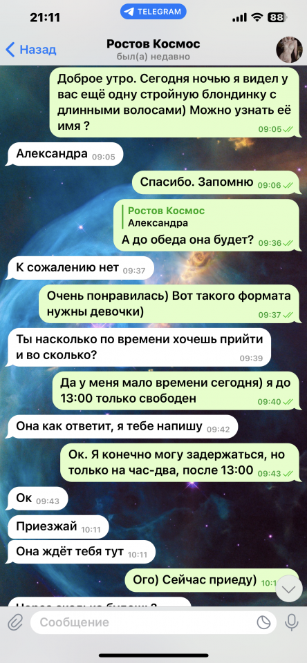 Побывал очередной раз в данном салоне Космос) Предложили блондинку Сашу, типаж мой, анкеты нет, есть одна фотка присланная в ватсап без лица.