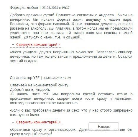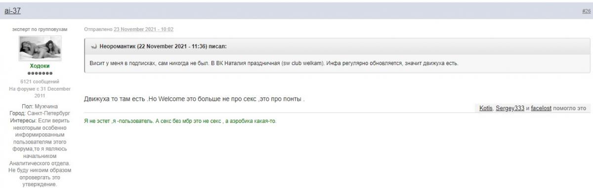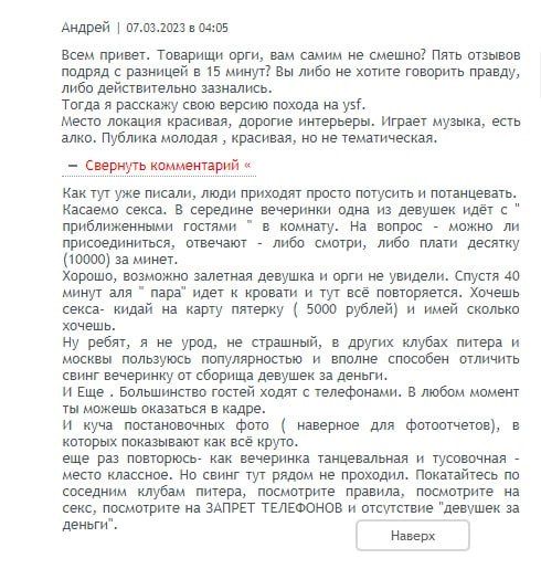 - Клуб действительно закрытый, находится ... (кто захочет тот узнает). Локация интересная, Дворик небольшой, на входе встречает хостес, неприкрытыми сиськами и сама хозяйка (которая всегда как электровеник, суетливая, слека смешная, постоянно на движе каком-то). Для новичков устраивает краткий экскурс показывает где открытый и закрытый приваты, старается познакомить с такими же новичками. Завсегдатаи (если можно таковыми кого то считать, как-то обособляются) ... На этом видимо антураж заканчивается... На входе бокал шампанского или вина... Далее все действо потихоньку начинается тайминг действительно есть. Но вначале натужно. Т.к. вначале публика не разогрета, а большинство публики которая с самого начала собралась, пришли для галочки (большой процент пар не готовы ни к чему, Мужики которые вцепились в своих жен/подруг ... нахрен они в целом пришли? половина баб с таким же подходом посмотреть, да и сексуальностью некоторые не блещут...