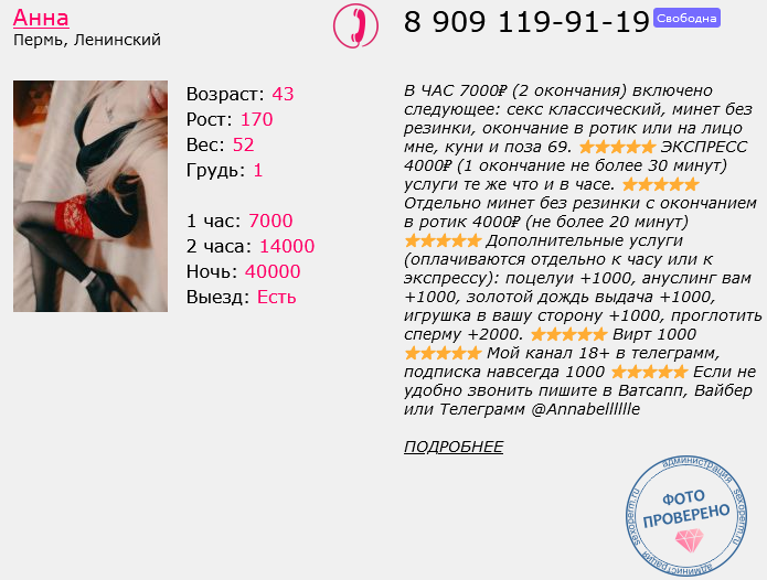 После возвращения из колыбели революции , славного города Питера, увидел анкетку и как то сразу захотелось горяченького, а там внутри - "В час включено - минет без резинки и классика в резинке, кончать можно в ротик, куни и 69, поцелуи, ануслинг, анилингус, золотой дождь выдача."