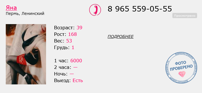 Итого: то что одёжу не снимала на протяжении всей встречи только подчеркивает, что дама четко заточена именно на экспресс и с не очень опытными молодыми 20 летними мальчиками, быстрое окончание. МБР с окончанием в рот в основной программе это конечно достойно внимания. На серьезный трах не настроена никак, но вполне способна пережить для нее такую обыденную и давно надоевшую процедуру. Но то что исполняет - достаточно технично и с опытом. В целом общается легко и приветливо, в деле очень давно, знает что к чему, какой подход нужен. Кто в минете слаще морковки ничего не пробовал, тот будет в диком восторге. Но я к сожалению чел окончательно испорченный Питерскими звездами, дикого влажного горлотраха. ИзображениеНедавно только оттуда потому все воспоминания еще очень свежее, может потому так и не оценил высоко.