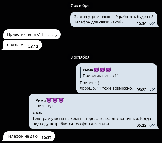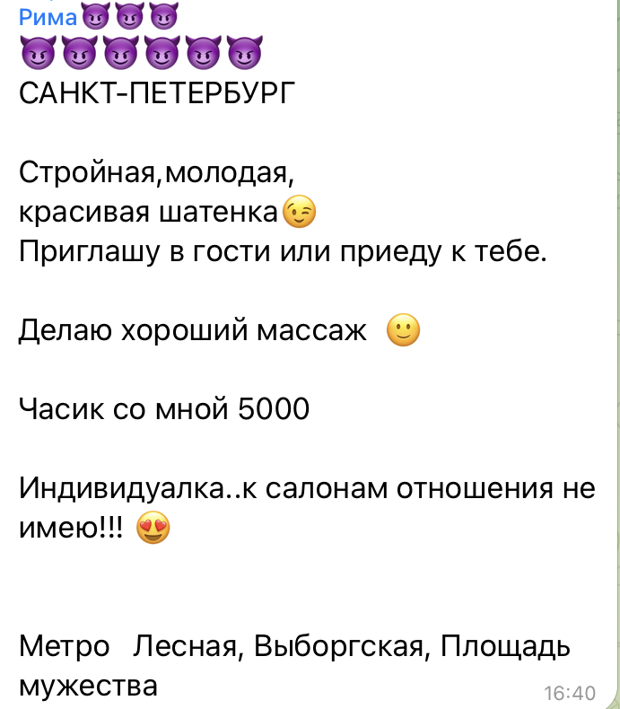 Договорились через тг на время, адрес Грибалёвой 7/1. Час 5к, мбр с овр отдельно тоже 5к, экспресс 3к. На что конкретно приеду не решили, просто, что во столько-то приеду. Потом пишу, что выехал.