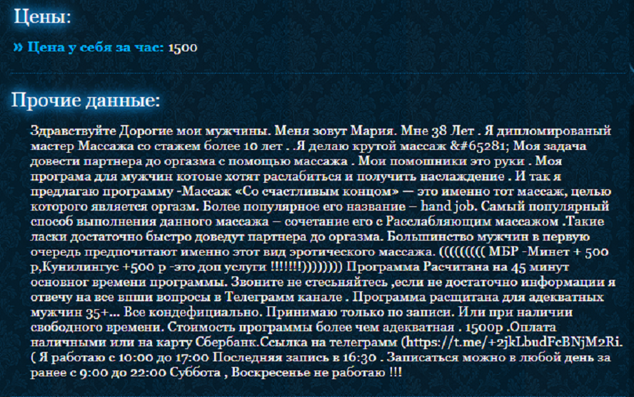 С дозвоном проблем не было , записался на время, приехал. Принимала Калинина 11. Квартира однушка с старым ремонтом (из нового только телевизор с музыкальным каналом) но чисто, бардака нет, душ , полотенце, массаж на диване. Окно занавешено, потёмки. Представилась Марией, на фото в анкете скорей всего не она (на этом номере телеграмм есть, там её фото есть) Возраст примерно соответствует лет 40 с небольшим. Темноволосая , средней полноты и среднего роста. Грудь где то три , вроде упругая , руками не трогал, только другими частями тела , так, что точно утверждать не буду. Лицо обычное, не страшное, не красавица , но совсем без эмоций и не разговорчивая. Как не пытался разговорить, за весь сеанс слов 10-15 всего сказала. Был на эротическом массаже за 1500 + 500 МБР. После помывки классическая часть, вроде, что то умеет не только поглаживания. Затем грудью елозить начала , спиной ощущал упругая. По приказу - переворот. Попытался снова начать разговор - тишина. Потянулся к титькам, отстранилась, сказала - Не надо! Хорошо по рукам не ёбнула. Прекратил попытки наладить контакт, просто лежал. Стала сильно елозить грудью с маслом по концу и всему телу. Елозила долго, потом МБР , натурально какой то жадный отсос. Приплыл от этого очень быстро. Не знаю счастливый конец мой был или нет. Помылся, смыл масло. На прощание - До свидания. сказала. Ушёл. Всё.