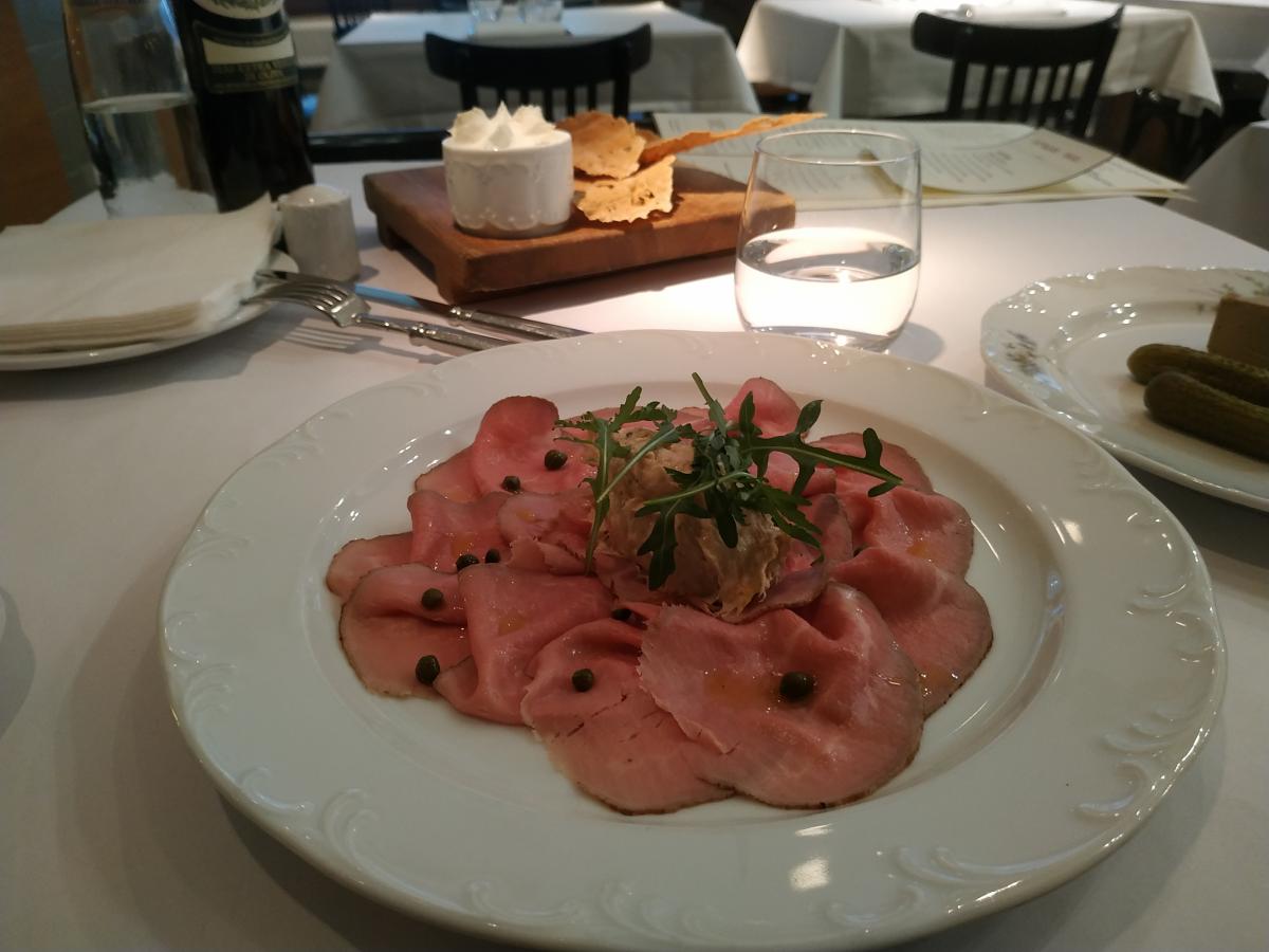 - Вителло Тоннато (890р) Не очень зашло. Телятина разложена неаккуратно, текстура рыбного соуса больше смахивает на кашу, чем на крем. Кусок "каши" шлепнули посередине, а не размазали по мясу. Каперсы могли быть лучше. В общем в Эль Лаго подача лучше и вкус ярче.