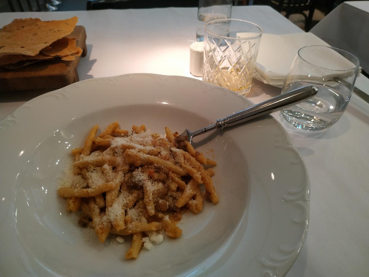 - Строццапрети с рагу из кабана и ндуей (1350р) Витые макарошки с мелко рубленой колбасой и характерно вонючим мясом кабана. Сверху посыпают тем самым 2х-летним пармезаном. Съедобно. Наваливают средне.