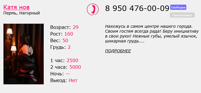 Первый раз позвонил какое-то время назад. трубку взяла сразу, посыпались вопросы как зовут, сколько лет (на кой хрен, казалось бы). Договорились через сколько приеду, а из центра на самый-самый Нагорный это п..ц. Доехал (с.ка, вовремя!), и всё, трубку не берёт. Минут 10 подождал и уехал.