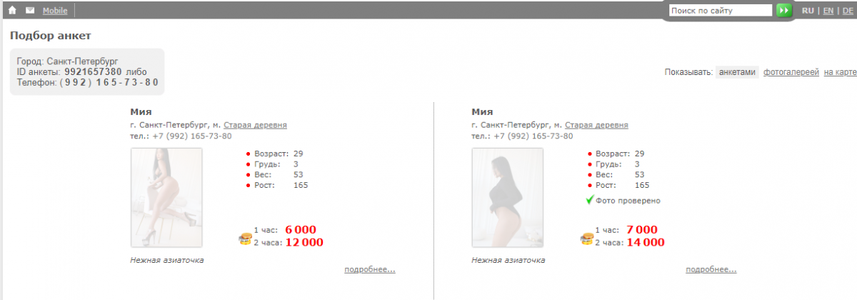Сейчас висят две анкеты зареганые на один номер, обе отключены. Разница между ними только в том, что в первой есть отзывы (во второй нет), во второй стоит галочка о проверенности фото. Может из-за "проверенности" фоток и наценка, лол? А может дева просто решила работать так сказать на два фронта - за 6к для постоянников и за 7к для новых клиентосов? Хз, короче. Хто этих фей поймёт.