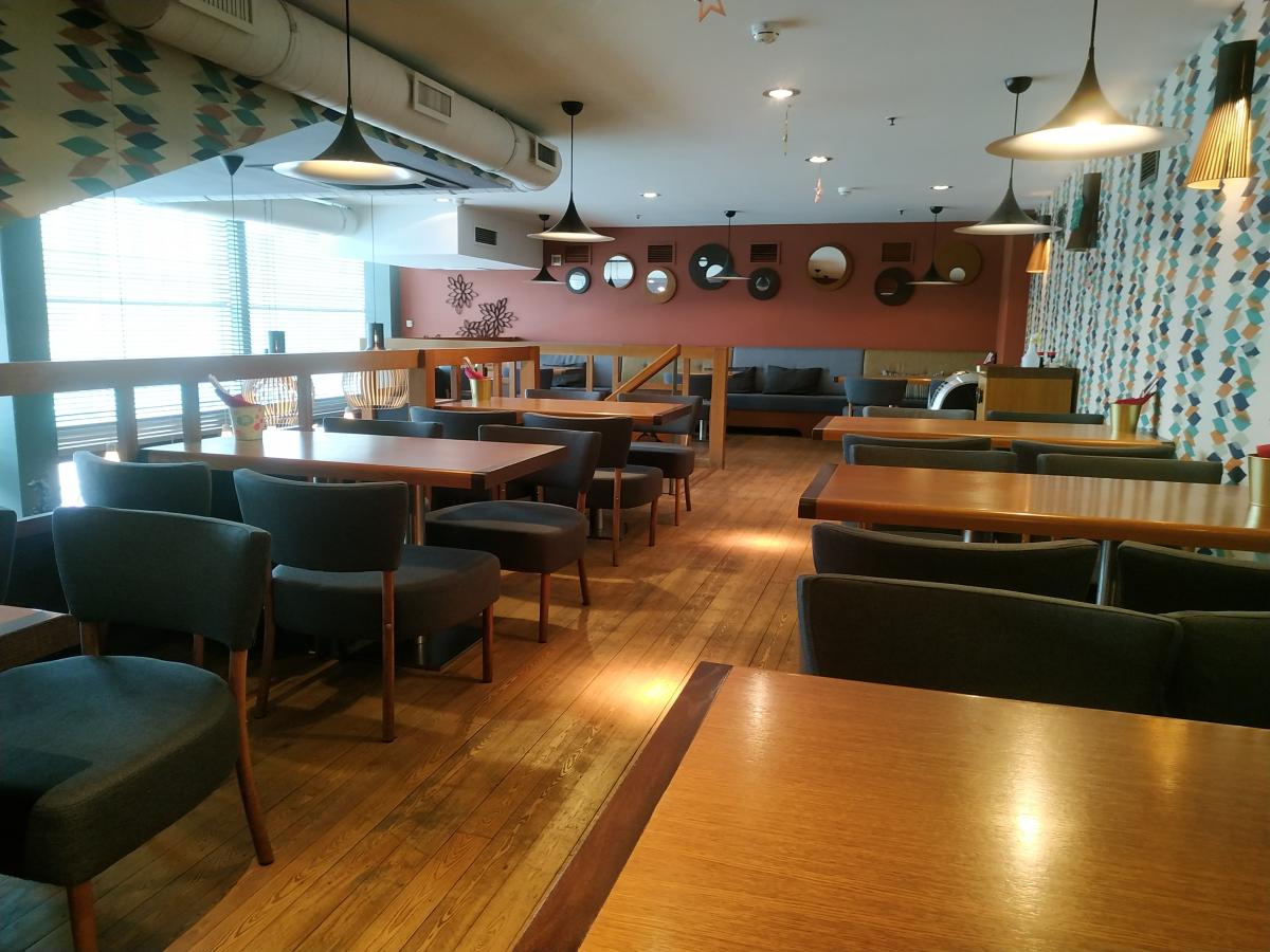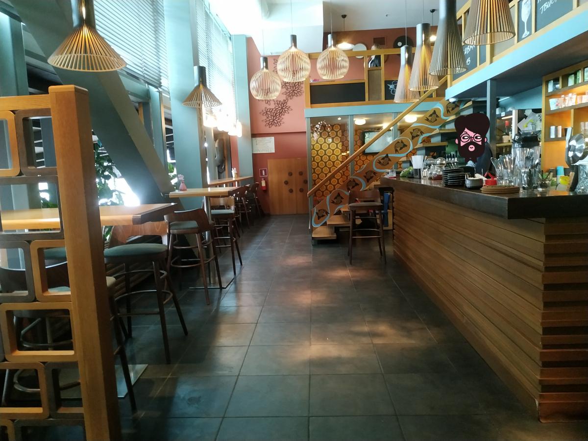Заведение делится на три уровня: первый этаж- светлый зал с панорамным остеклением и растительностью в углу. Чуть выше барная стойка с барной скамьей, стулами, детской комнатой. И второй этаж. Деревянно-стеклянный минимализъм. На патефоне джаз. Заполняемость невысокая, официанты услужливые, в меню разбираются хорошо. Не понравились низковатые столы-стулья, на втором этаже в дальнем углу вибрируют столы от неведомой работающей хуйни за стеной + на втором часто жарко, + заказ часто несут долго.