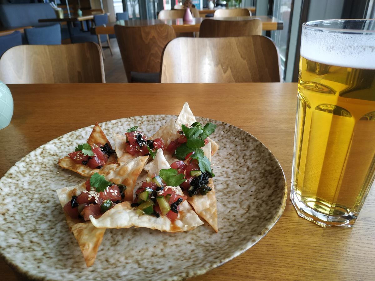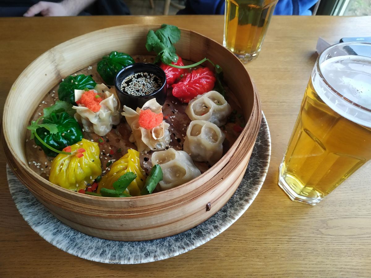 Первый раз заходили с коллегами по опасному бизнесу, испили по литеру отечественного пилзнера на разлив, под названием Stamm "Young Lordship" (0.4/370р) - среднее пивко, пить можно. Из пива ничего паназиатского у них нет, только наше. Чёто на кране, чёто в банках. Выбор алкашки полная хуйня. Закусили чем-то вроде тартара из тунца на чипсах с водорослями, пошинкованными огурцами и кинзой (570р/порция) + взяли набор димсамов, 12 китайских пельменей с рыбой, мясом, креветками. Всем всё зашло кроме меня. Вегетарианские пельмени - невнятная шляпа, рыбные - тоже не очень.