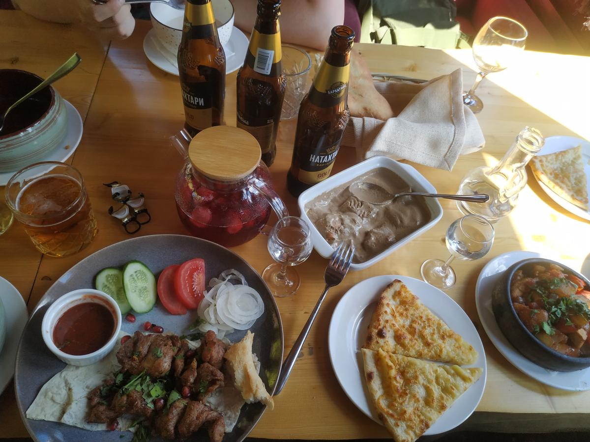 Брали, едали: хинкали 10шт грибы-сыр (900р), уха по-фински (510р), 2 харчо по (510р), салат Арагби (490р), сациви (550р), хачапури по мегрельски (580р), шашлык из свиной шеи (580р), оджахури с курицей (540р), пиво светлое "Натахтари" (390р/0.5), вотка Царская Золотая (160р/50мл), чайник Сенча (430р), литр домашнего лимонада (860р), пури (90р)