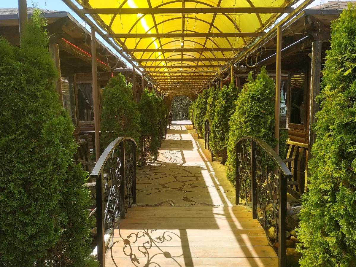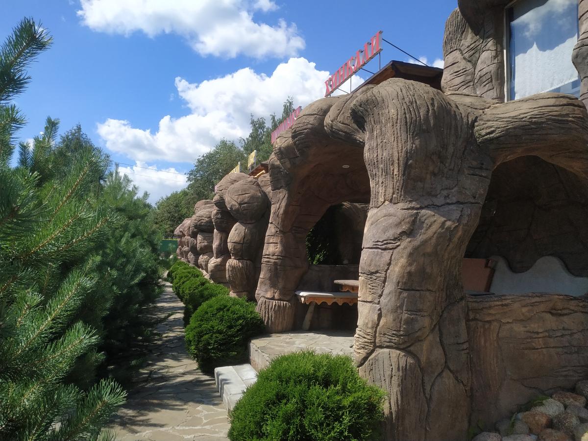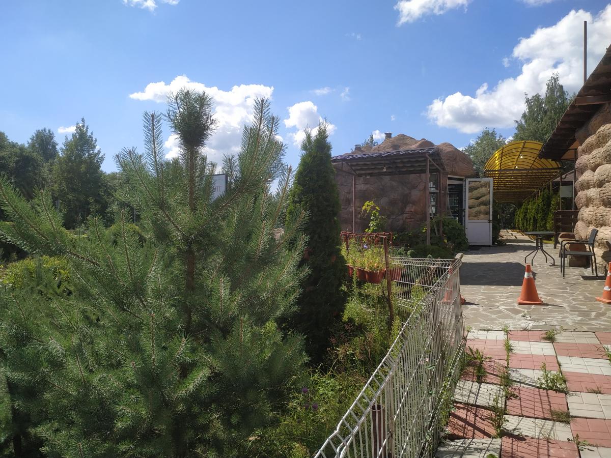 Понравился кабак тем что расположен на берегу реки, с приятными видами на зелень. Ландшафтный дизайн весьма неплох: ёлки, туи, цветы, фонтаны, на нижнем уровне открытые беседки в каком-то пещерном стиле. Наверху, помимо зала, в два ряда идут закрытые отдельные беседки на 6-8 человек, в разных исполнениях по убранству.
