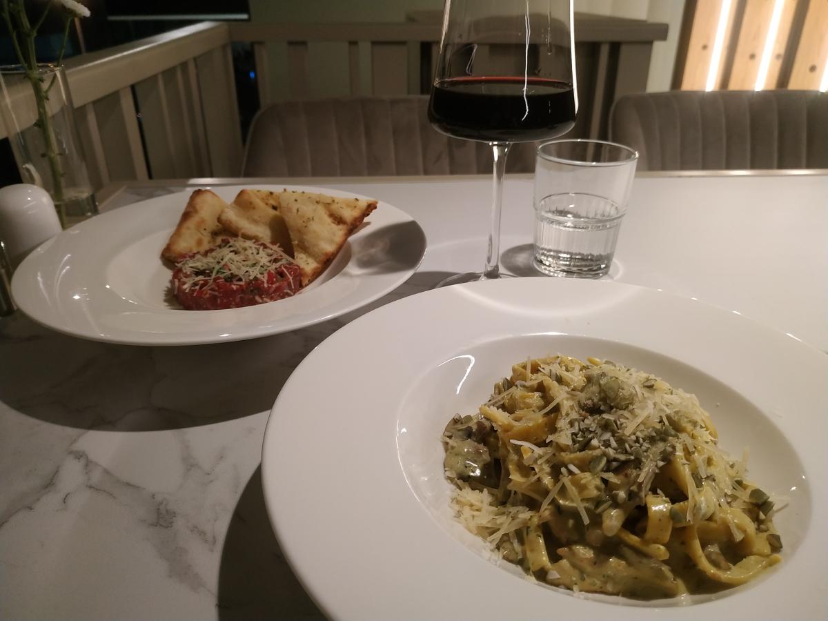3) Тельятелле с курицей и грибами в соусе песто (550р) - спорный вариант. Кура сухая и её недостаточно, грибы беспонтовые шампиньоны, соус лучше бы добавили сырно-сливочный типа Альфредо. Пармезан вроде не самый дешёвый.