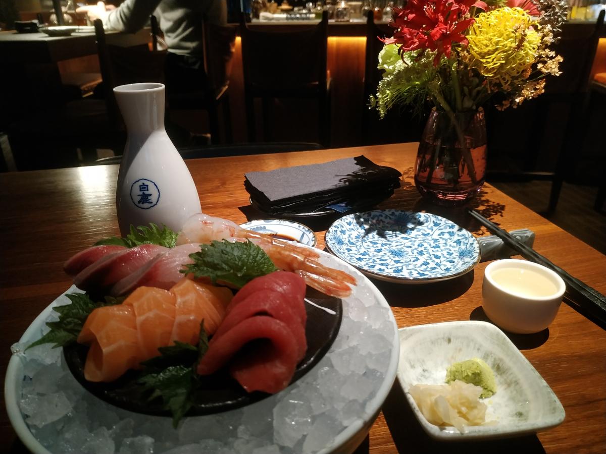 1) Четыре варианта сашими: дикий лосось (780р), хамачи (1750р), тунец "Блюфин" (2150р), креветка "Ботан" (2100р) - приносят на льду, прокладывают шисо, по виду похоже на крапиву, с непонятным вонючим вкусом. В каждой позиции три брусочка рыбы, но креветок кладут две (да-да, 1050р за ОДНУ креветку). Рыба свежая, вкусная. Креветки честно говоря не понял, сырое "масло" с тем привкусом морских водорослей...
