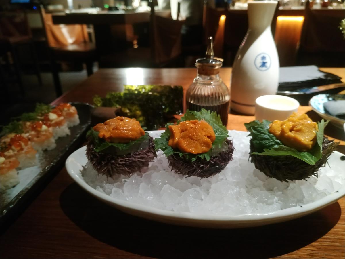 2) Три морских ежа (890р/штука) - вкусные ежи, в половину панциря ежа кладут лёд, на него лист шисо, а уже на него ежа. Без перепелиного желтка. К ежу дают пондзу соус, какой-то копчёный...