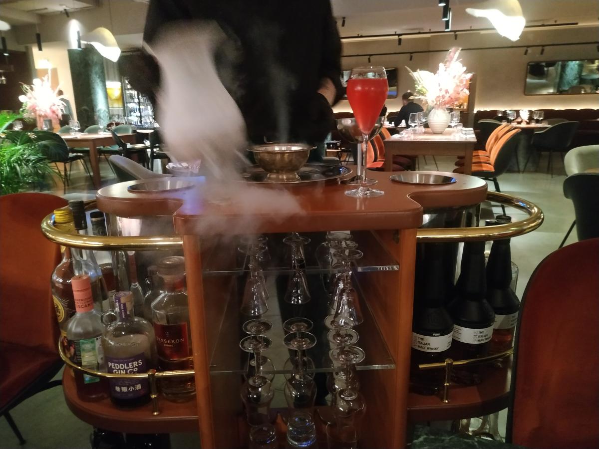 1) Первым делом заказал их фирменный коктейль "VOLO" с шоу-подачей (2500р) - бармен прикатывает сервировочный стол, просит выбрать основу из трёх видов джина Ginato, затем начинает химичить, больше с жидким азотом, с помощью которого делает дополнительно к коклейлю гранитку - сицилийский десерт из фруктового льда с сахаром. В сам напиток входят: джин, маракуйя, мята, сладкий вермут. Вкусно.