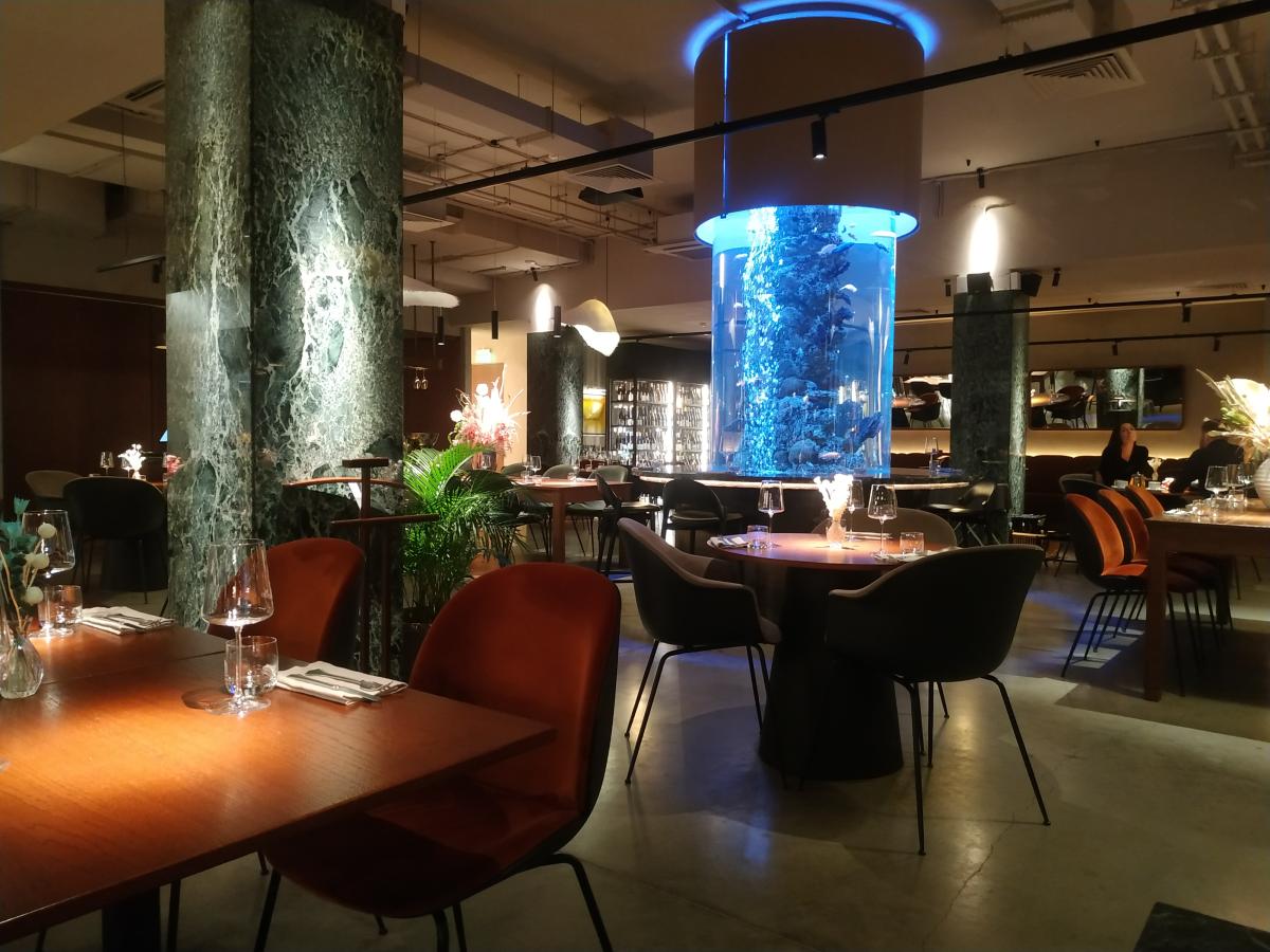 Будний день, первая половина. Посетителей почти нет. На входе собрался скучающий отряд хостесов, официантов, и какой-то дядя, помогающий запрятать тулуп в шкаф. Столы предлагают любые, столов много. Зал большой, оформлен соответствующе: прямоугольные колонны отделаны под мрамор в морском стиле, люстры в форме медуз, и, главное, посерёдке здоровенный колонна-аквариум от пола до потолка, с круговой стойкой, за которую можно засесть и медитировать, глядя на рыбов.