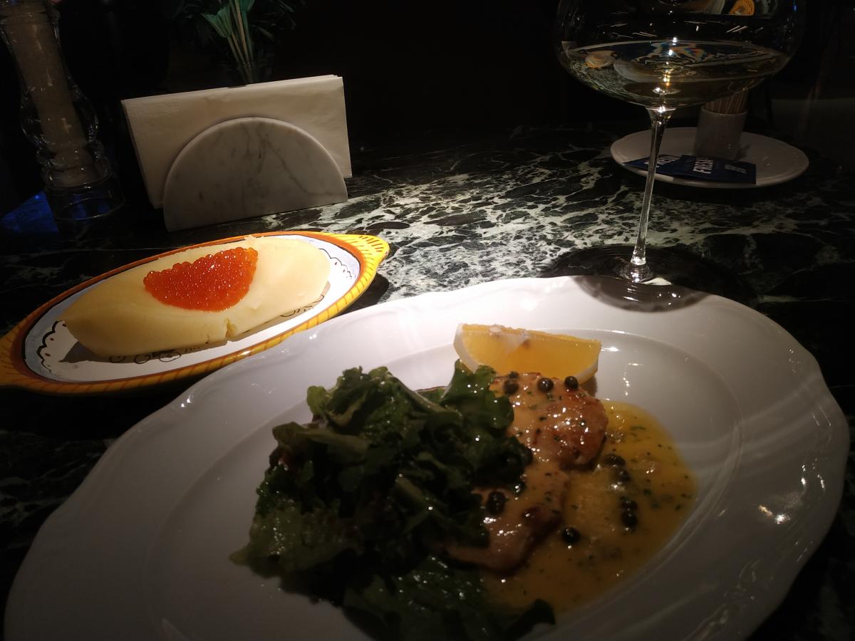 3) Рыба-меч с зелёным салатом (2650р) + гарнир пюре с красной икрой (1000р) - рыба сочная, с тем непонятным салатом и каперсами сочетается хорошо.