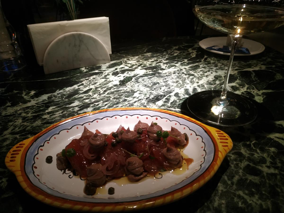 4) Тонно-тонато (1900р) - суть как вителло тонато, только вместо маринованной телятины сашими тунец. Не стоит своих денег. Тунец с рыбным крем-соусом - такое себе, на любителя.