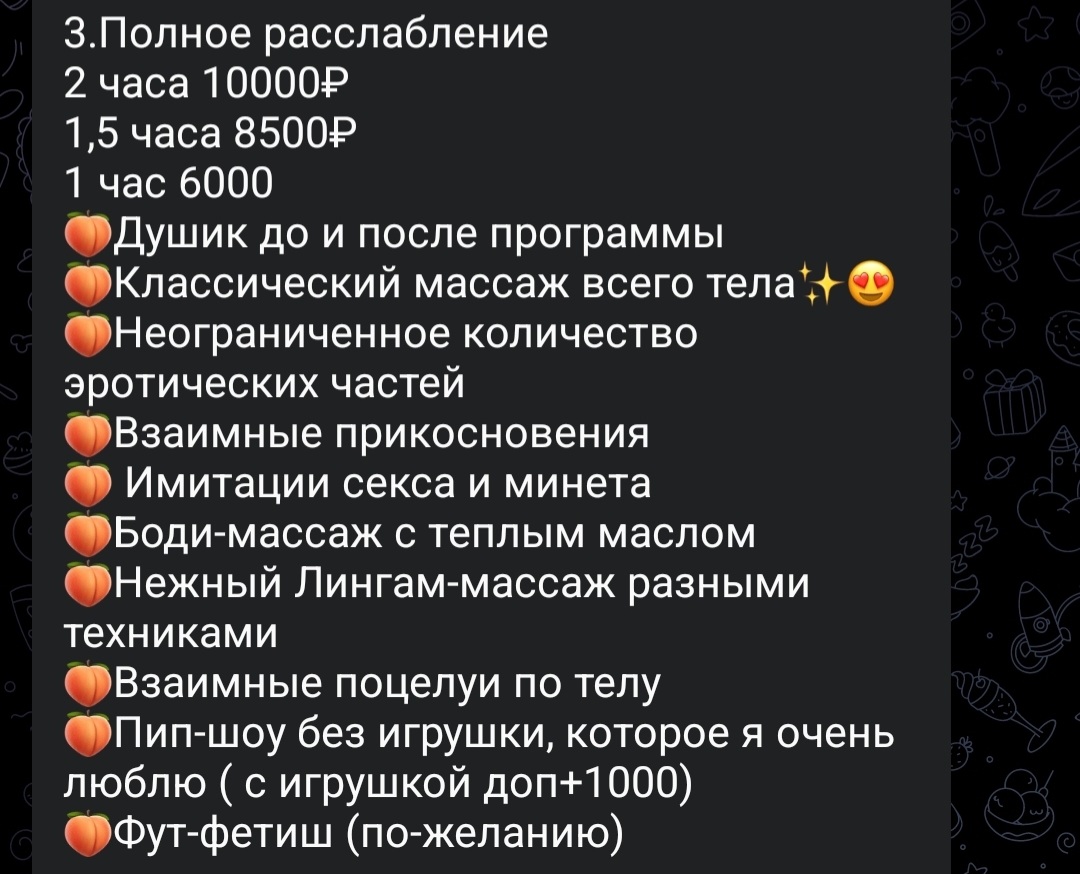 Покупка полотенца, цена всего действа изложенного ниже 9тыс. За час. По программе полное расслабление 6тыс. да плюс еще решил взять до пущей тактильности и развратности куни чтоб его за 3 тыс.