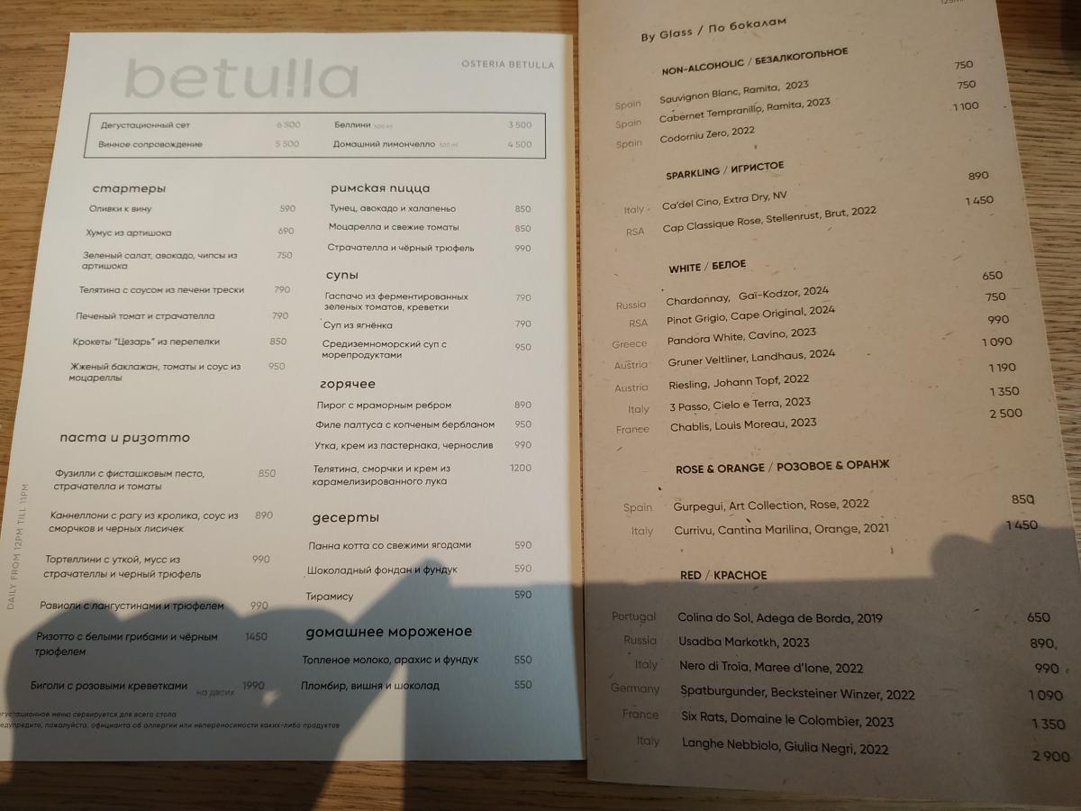 Основное, то что предлагают в первую очередь, это дегустационный сет (6500р). Особо ничего в нём эксклюзивного нет, кроме десерта "Карта Италии". Что туда входит- неведомо, только лишь спрашивают про аллергии и что из продуктов не едите. Состоит из 9 курсов: