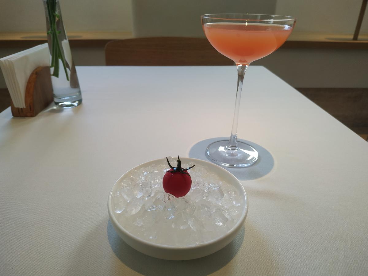 Перед началом подали конфету в виде черри и коктейль Беллини (белое вино+ персиковое пюре)