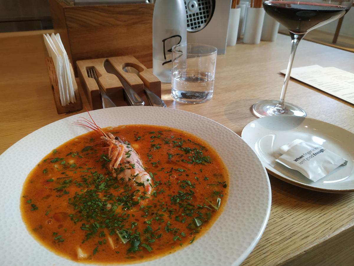 5) Средиземноморский суп (950) - со здоровой лангустиной, которую надо ещё разобрать. В целом по вкусу неплохо.