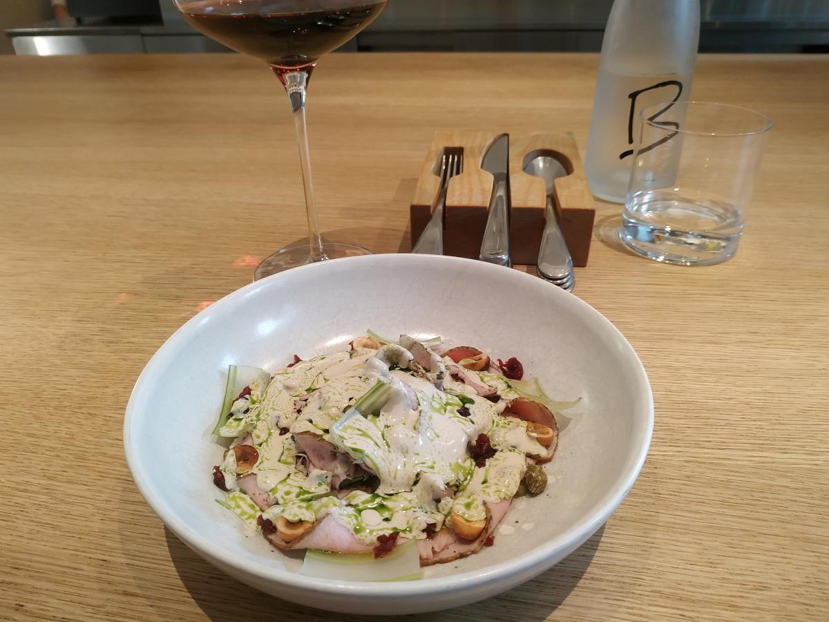 3) Телятина с соусом из печени трески (790р) - уже по названию понятно, что это интерпретация на вителло тоннато. С сельдереем и фундуком. Странно эти два ингредиента там видеть, ну да ладно, съесть можно.