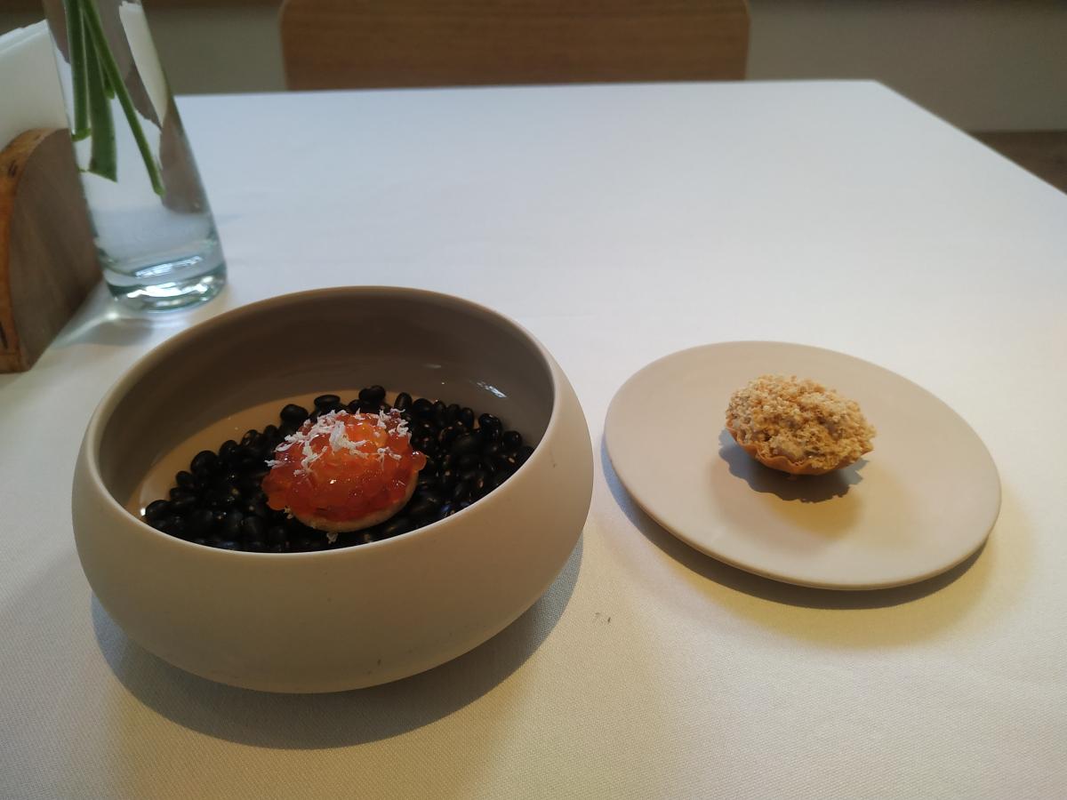 1) Амюз-буш. Блин с класной икрой, кремом на основе хрена и укропа. Плюс рваная телятина с соусом а-ля вителло тоннато.