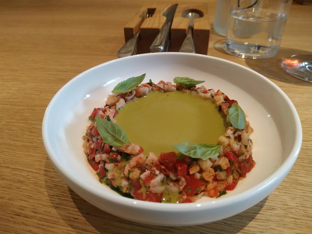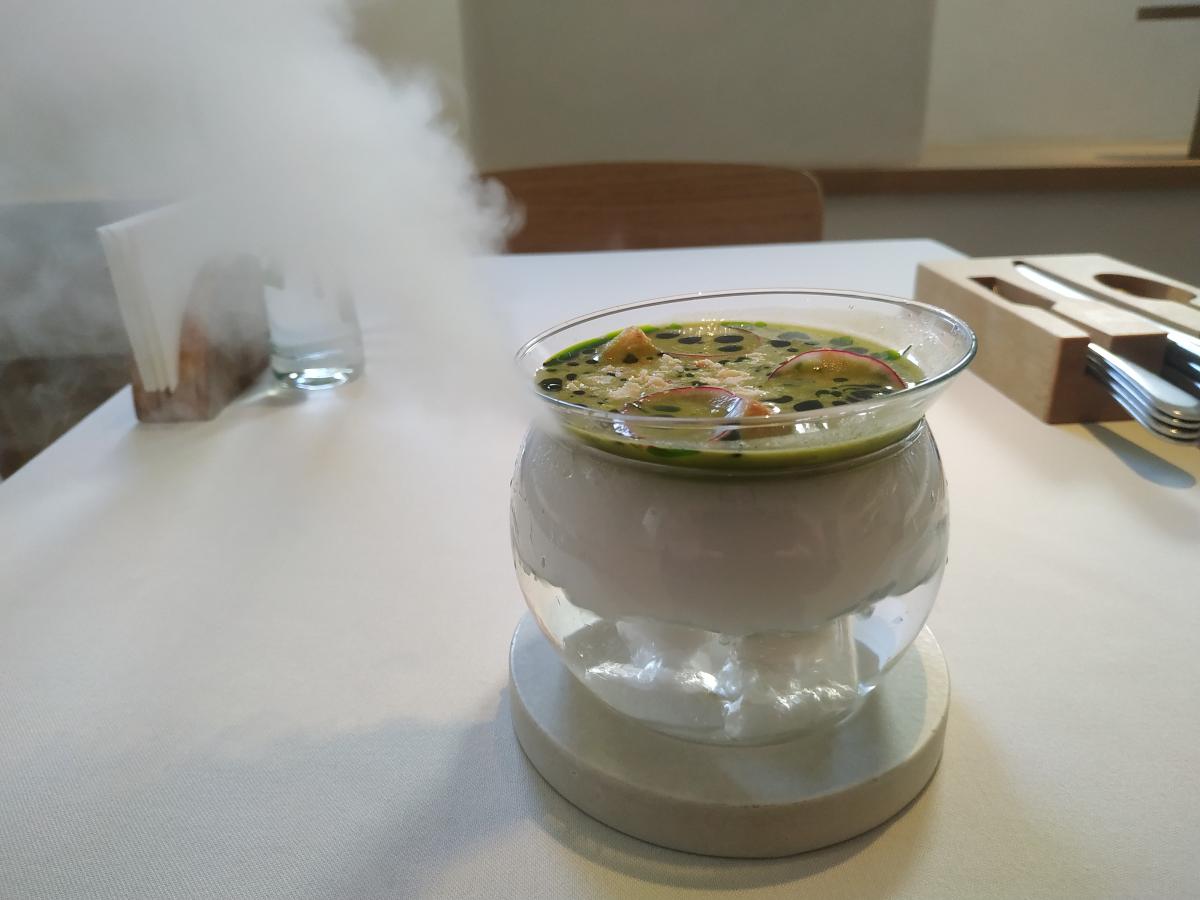 4) Суп гаспачо из ферментированных зелёных томатов + рубленные креветки. В сете шоу-подача- приносят тарелку на аквариуме, в котором бурлит и парит сухой лёд. В а-ля карт сухого льда нет, но подача тоже занятная, - на тарелке формируют борта из тартара креветок, помидор, салата и сухариков, а уже потом заливают гаспачо (790р)