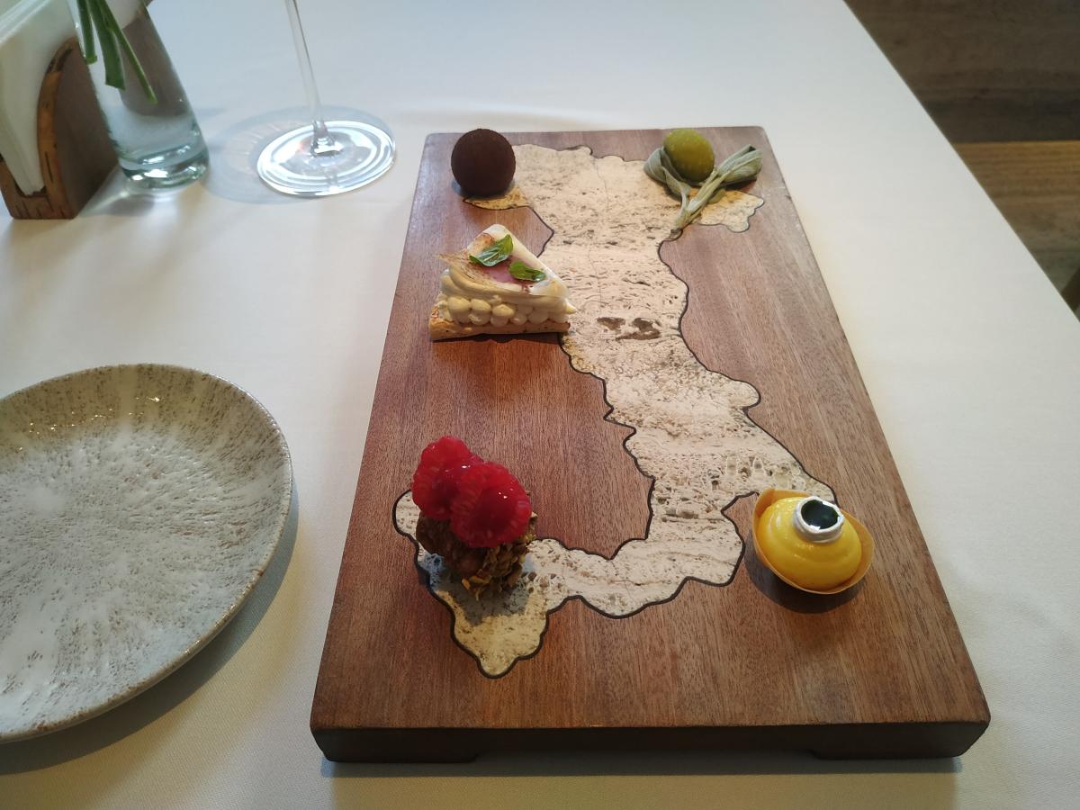 9) Десерт "Карта Италии". Самое интересное что есть в сете. В меню такого нет. Приносят доску с картой Италии, на которой с юга на север выложено 5 десертов на один укус (некоторые с жидким центром). Десерты по регионам: Сицилия -канноли с фисташкой и свежей малиной; Амальфитанское побережье- лимонный тарт; центр- "сладкая пицца" с обжаренной моцареллой и клубничкой; Лигурия -"оливка" с чёрной смородиной и грушей; Пьемонт- шоколадная конфета с пастой из лесного ореха. Вкусные интересные микро десерты.