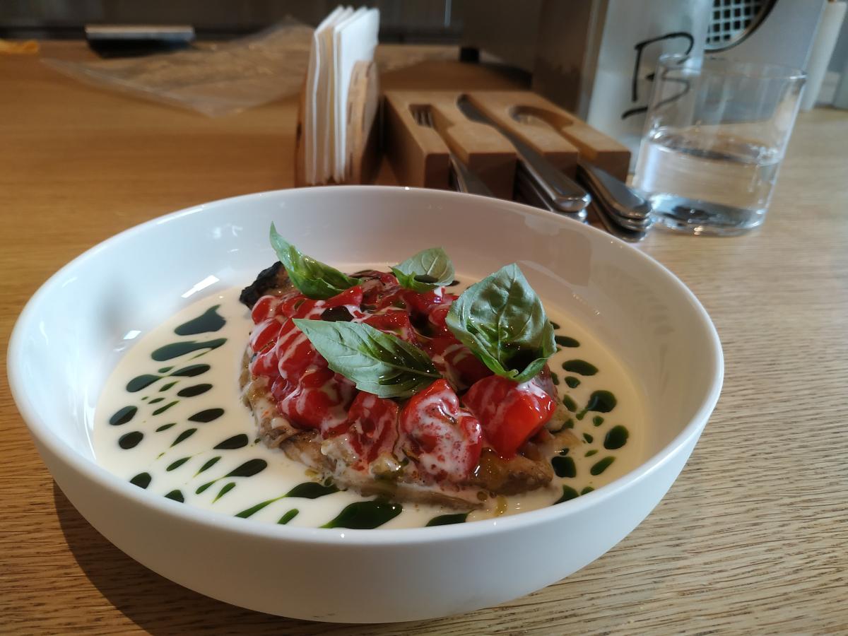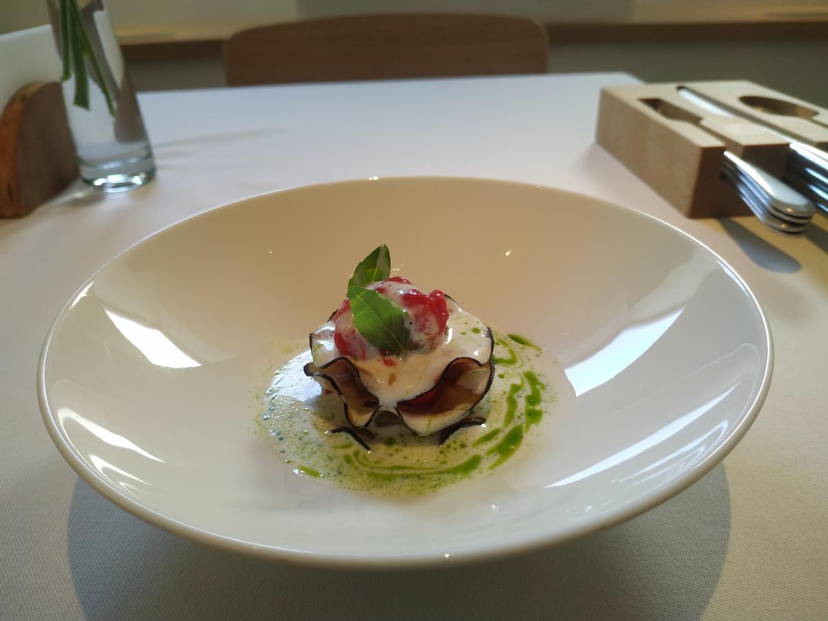 3) Милфей из жженого баклажана и томатов с соусом из моцареллы. Немного в изменённом варианте полноценное блюдо в меню так же есть (950р)