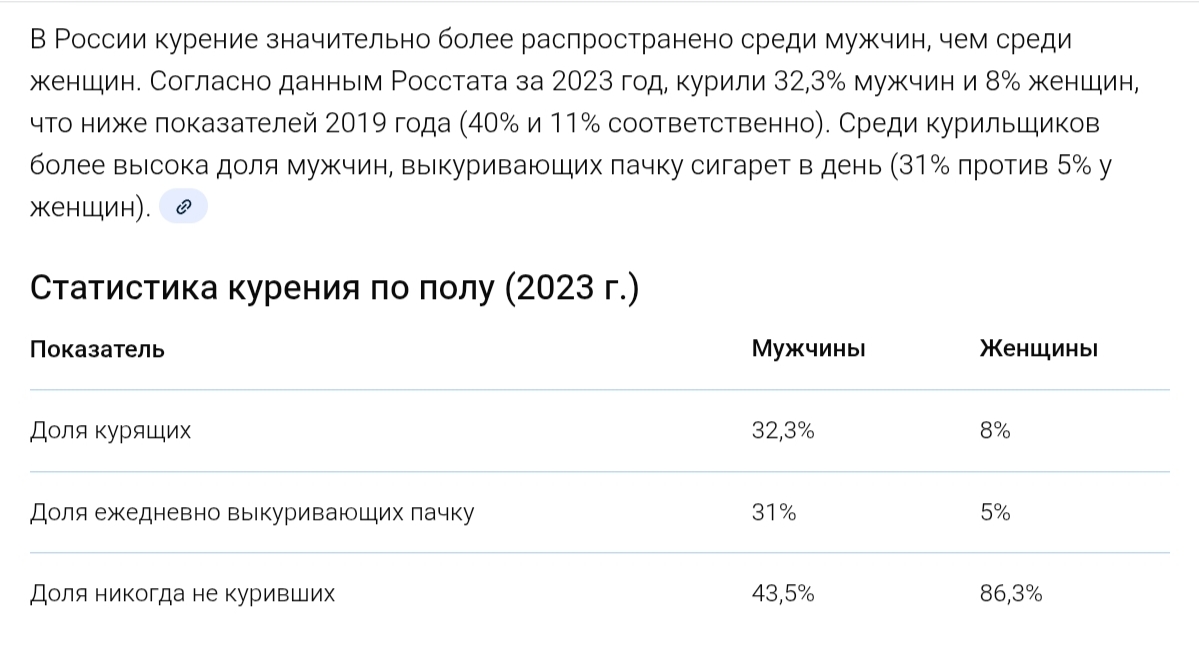 Во-первых, есть у меня большое подозрение что, к примеру, каждодневное курение табака здоровье губит гораздо сильнее чем время от времени или даже регулярно прибухивать. Ну и конечно тут можно продолжить: "До свадьбы не курил, но женился и тут же взялся за сигареты" но это будет совсем смешно потому как курить если и начинают то гораздо раньше обычно. А статистика говорит о том что курят мужчины гораздо чаще.
