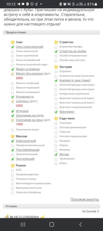 По процессу девчонка старается доставить удовольствие тебе, а не просто ждет время, позы с радостью меняет, озвучка естественная, не наигранная , час 6к, поцелуи как доп(2к), минет на уровне с окрестностями, если в общем по сексу то такой страсти у девушек данной профессии не видел давно, здесь прям было кайф, эмоционально очень зашло.