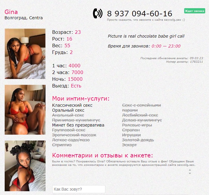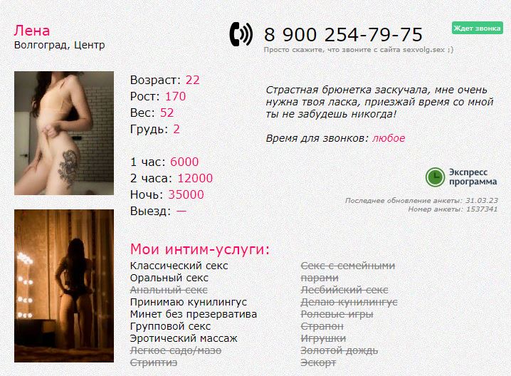 Не писатель - ходок. Недавно в Волгограде. Тоже был в гостях.Стройная девушка, с приятной фигуркой, небольшой грудью, упругой попкой и накачанными губками. Встретила хорошо, вежлива-приветлива. Кошечка-мурчалка - прикольная.Поцелуи при симпатии - есть, мбр тоже - хочешь нежно и неспешно или активно и ритмично и без зубов. Приятно. Клитор скрыт в складочках, но если проявить пытливость и хорошо присосаться - девочка приятно кончает от куни. Не гадкая симулянтка - подстраивается под партнёра - видно желание и интерес. Сексует - зачётно, сама предлагает позы. Миссия, стоя, сзади - всё отлично. Не торопит, не капризничает. Пришёл на час по факту пробыл дольше.