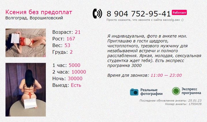 https://sexovolg.men...a/6074шестьтри/ тоже не плохой вариант, фотки в анкете еë, но им лет пять не меньше. На 1-1,5 года вообще пропадала из бизнесса, вновь появилась недавно, пока что не могу к ней попасть, хз в какую сторону она за это время изменилась, и она ли вообще по этой анкете, атак несколько лет назад была охуенной.