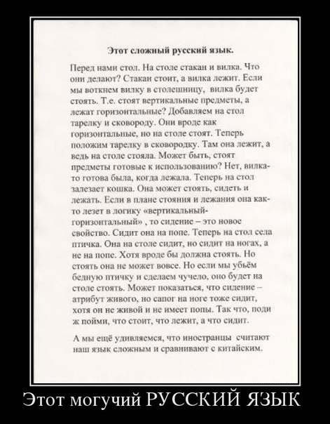 Перед нами стол. На столе стакан и вилка. Что они делают? Стакан стоит, а вилка лежит. Если мы воткнем вилку в столешницу, вилка будет стоять. Т.е. стоят вертикальные предметы, а лежат горизонтальные? Добавляем на стол тарелку и сковороду. Они вроде как горизонтальные, но на столе стоят. Теперь положим тарелку в сковородку. Там она лежит, а ведь на столе стояла. Может быть, стоят предметы готовые к использованию? Нет, вилка-то готова была, когда лежала. Теперь на стол залезает кошка. Она может стоять, сидеть и лежать. Если в плане стояния и лежания она как-то лезет в логику «вертикальный-горизонтальный» , то сидение - это новое свойство. Сидит она на попе. Теперь на стол села птичка. Она на столе сидит, но сидит на ногах, а не на попе. Хотя вроде бы должна стоять. Но стоять она не может вовсе. Но если мы убьём бедную птичку и сделаем чучело, оно будет на столе стоять. Может показаться, что сидение - атрибут живого, но сапог на ноге тоже сидит, хотя он не живой и не имеет попы. Так что, поди ж пойми, что стоит, что лежит, а что сидит. А мы ещё удивляемся, что иностранцы считают наш язык сложным и сравнивают с китайским.