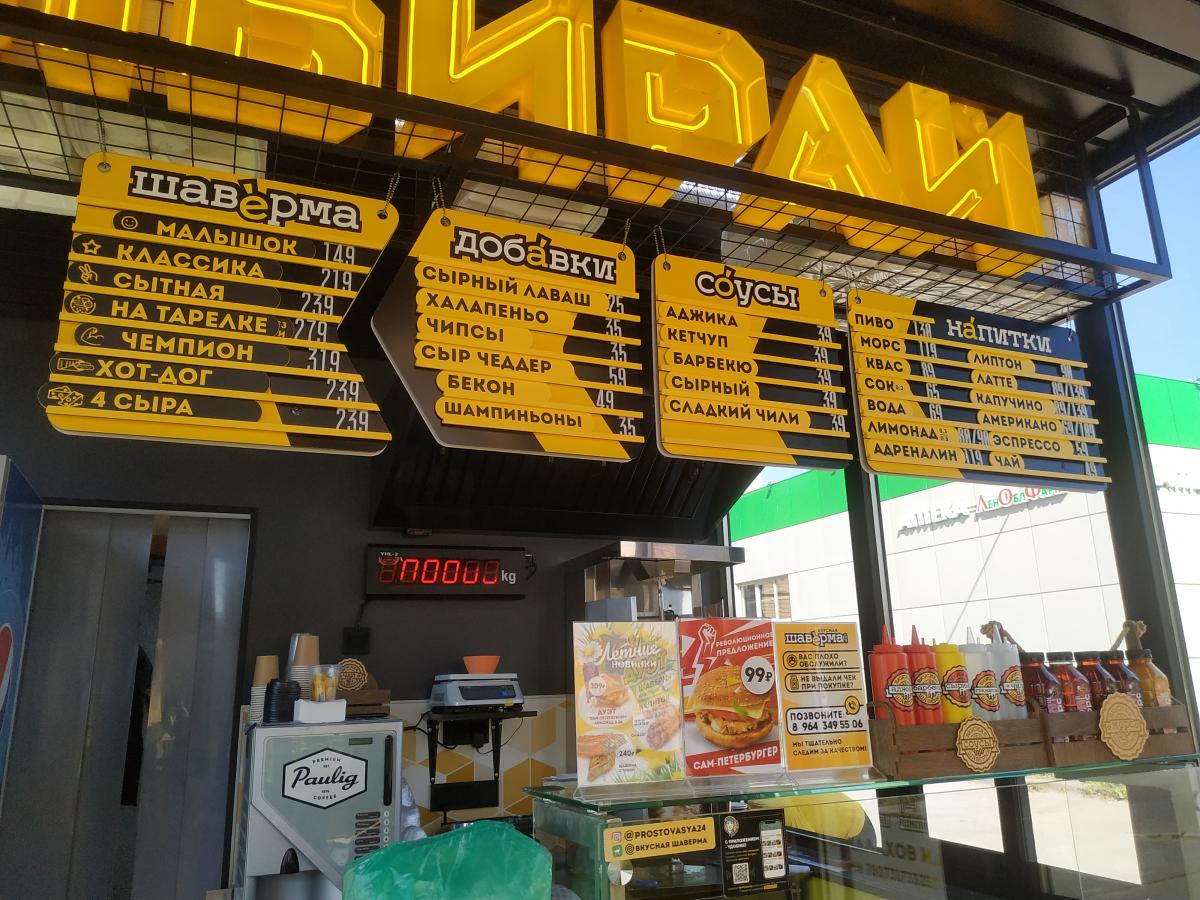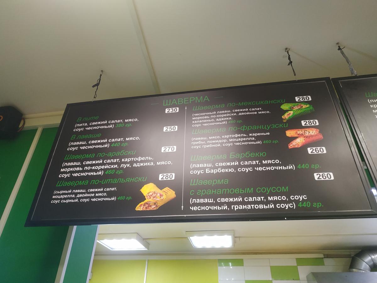 Форсят уже около 3-х недель шавермочную по всем интернетам. Из-за вывески конечно. Сейчас замотали, ибо 25 отдел полиции не оценил креатива (со слов шавермье). По сути ничего особенного там нет. На хайпе цены заряжают космические, а народ всё одно валит. Вот и я стал жертвой маркетинга. Брал малую шаву с грибами и сыром (280р) банка колы 0.33 (80р) горячий шоколад 150 мл (100р) с/у нет, пива нет. Кофе 8 вариантов, всё по 100р. Само помещение 3х3 с 2 высокими стойками и бырными стульями вдоль стен. Хуйня короче.