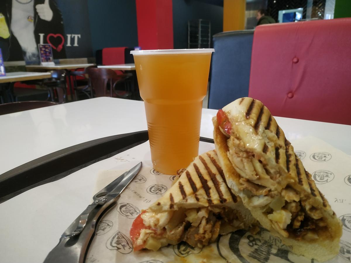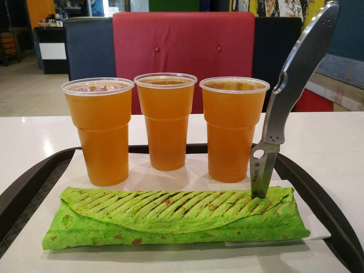 Кроме шавермы там действительно есть блины, супы, ещё что-то, чай, кофе, морс, прекрасный квас, пиво. Причём напитку подают в стекле, никаких бумажных или пластиковых стаканов.