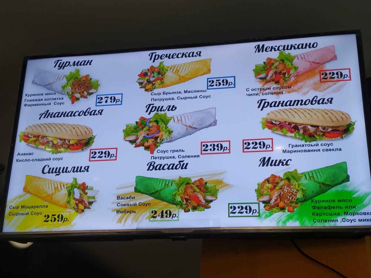 Большой выбор кавказских, итальянских, мексиканских и т.д. вариантов шавермы. Большие и маленькие порции в лаваше (или разных аналогах, уже не помню).